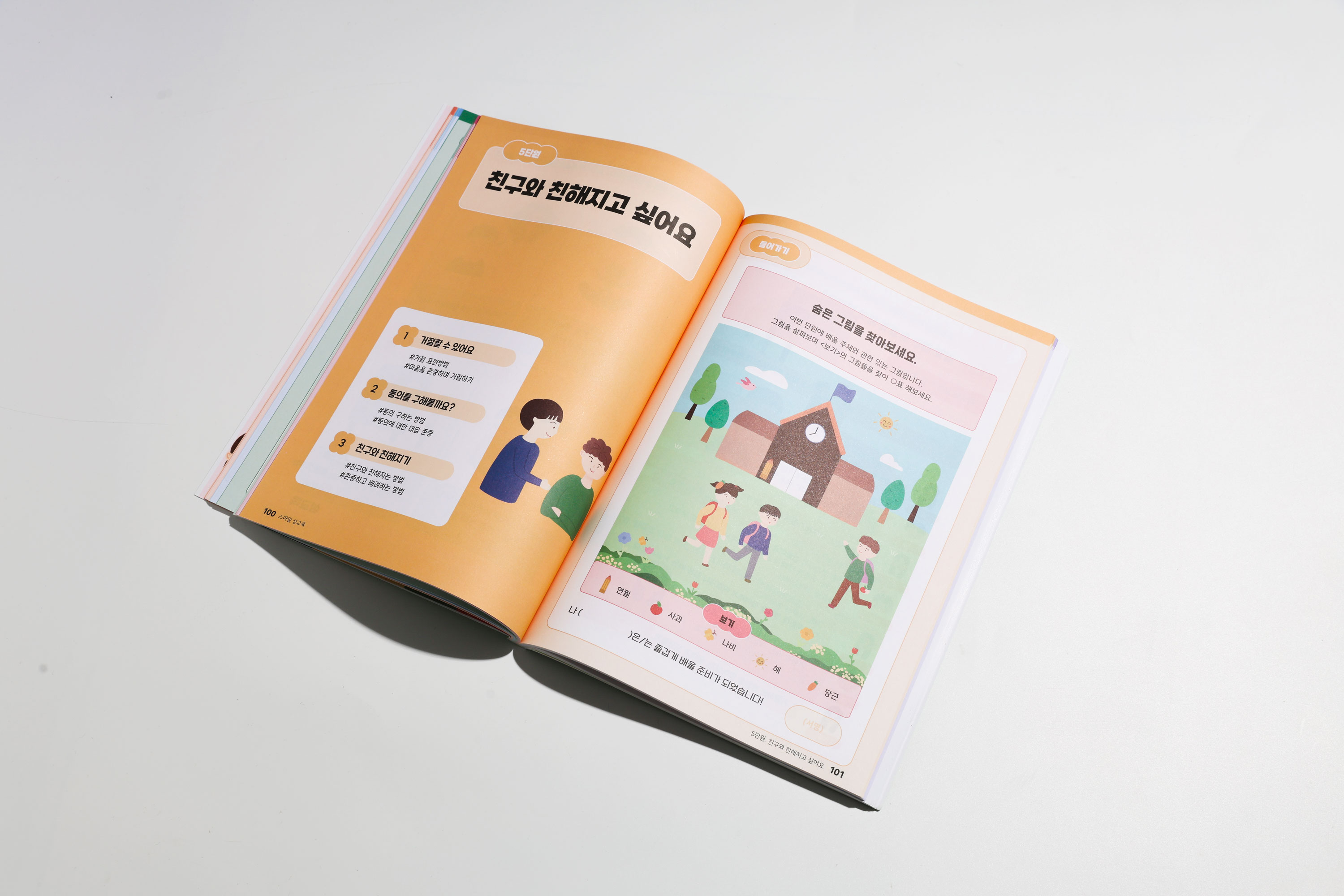 모듀efe는 특수교사들이 모여 배움이 느린 아이들을 위한 교재교구를 만드는 교육 콘텐츠 브랜드입니다. 성교육을 처음 시작하는 어린이를 위한 읽고, 쓰고, 오리고, 붙이는 성교육 교재의 「스마일 성교육」시리즈의 마지편, <사춘기편> 교안 작업에 함께 하였습니다. 본교재는 밝은 색상 표지와 가독성이 좋은 디자인으로 후킹을 주며, 아이들이 이해하기 쉽도록 각 챕터마다 색상을 구분하였습니다. 더불어 불필요한 디자인 요소를 제외하여, 학습에 집중할 수 있도록 하였습니다.